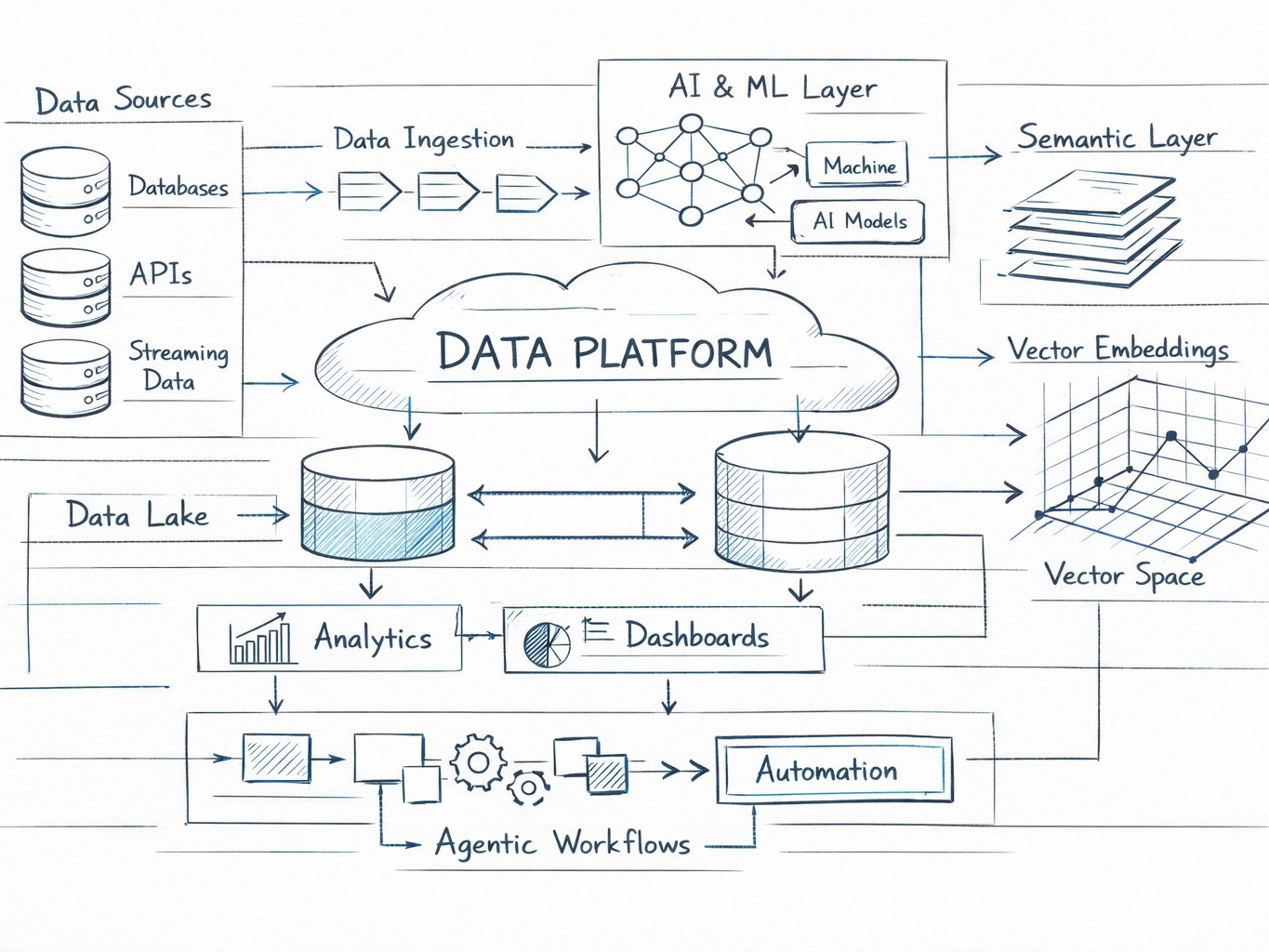 A working view of the data platform architecture we think in. From ingestion through analytics to agentic workflows.